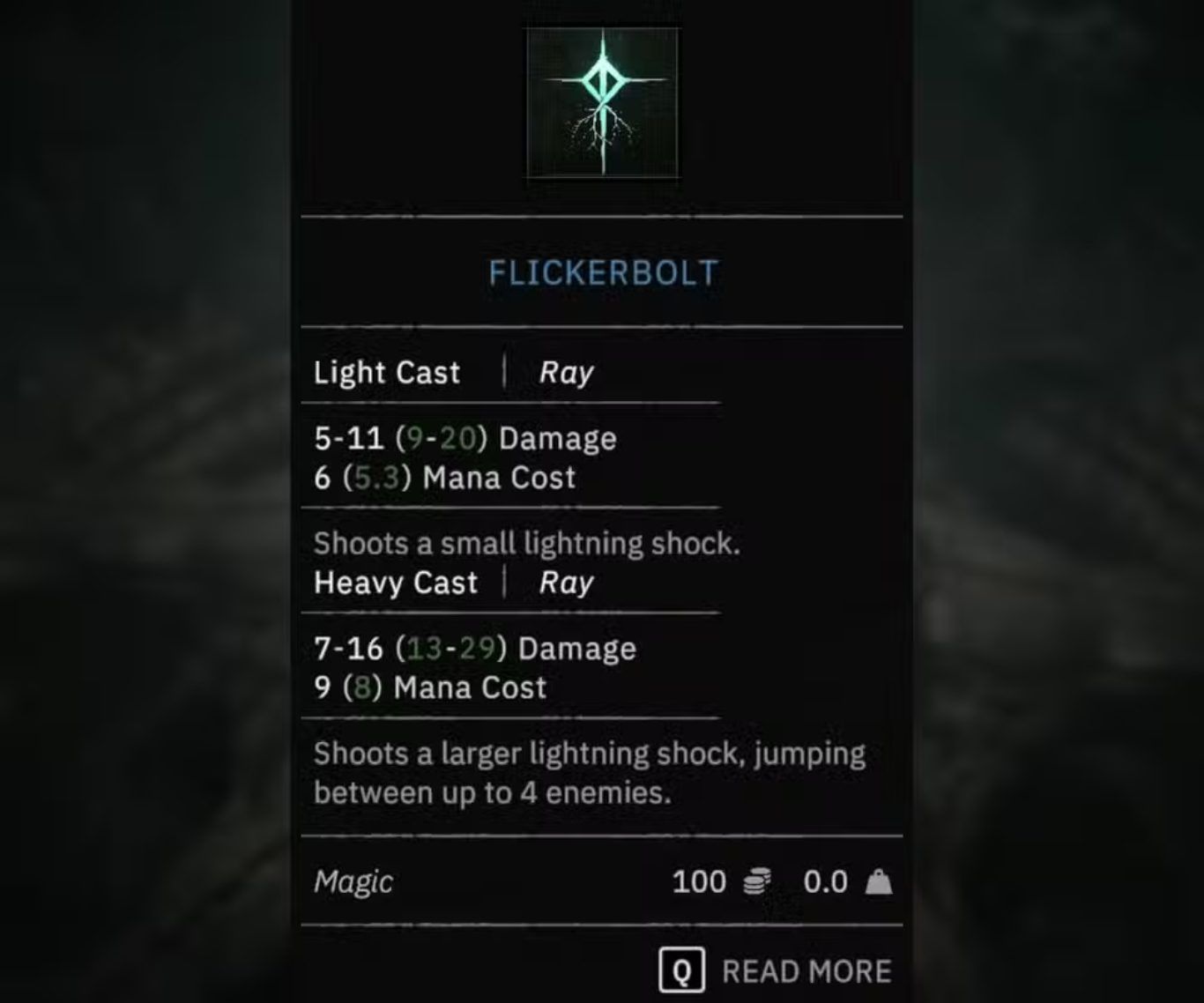 تعد تعويذة Flickerbolt واحدة من التعويذات السحرية التي يمكن للاعبين استخدامها في المراحل الأولى من لعبة Tainted Grail The Fall of Avalon حيث تمنح المستخدم قدرة على إلحاق ضرر عنصري يعتمد على طاقة البرق. توفر هذه التعويذة خيارا جيدا للاعبين الذين يرغبون في بناء شخصية تعتمد على السحر منذ بداية اللعبة لأنها تمنحهم وسيلة مباشرة لمهاجمة الأعداء من مسافة آمنة باستخدام طاقة كهربائية سريعة.