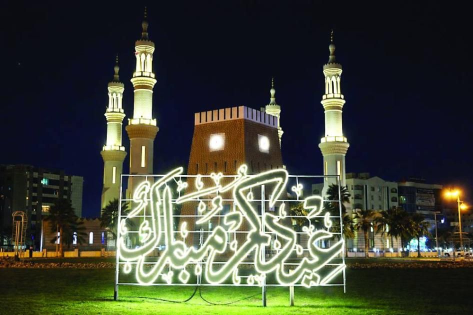 وعملت فرق البلدية على تركيب مئات التشكيلات المضيئة، التي تحمل عبارات وكلمات المعايدة المتعارف عليها بين أفراد المجتمع الإماراتي، مثل: «كل عام وأنتم بخير»، «عيدكم مبارك»، «ينعاد عليكم بالخير»، «عساكم من عواده»، «من العايدين والسالمين»، «من العايدين والغانمين»، ليكتمل المشهد الجمالي لزينة العيد والمظهر العام للمدينة.