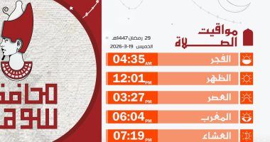 الخميس، 19 مارس 2026 10:13 صأعلنت الجهات المختصة مواقيت الصلاة اليوم الخميس الموافق 19 مارس 2026، والموافق 29 رمضان 1447هـ، وذلك وفقا للتوقيت المحلي لمدينة سوهاج.