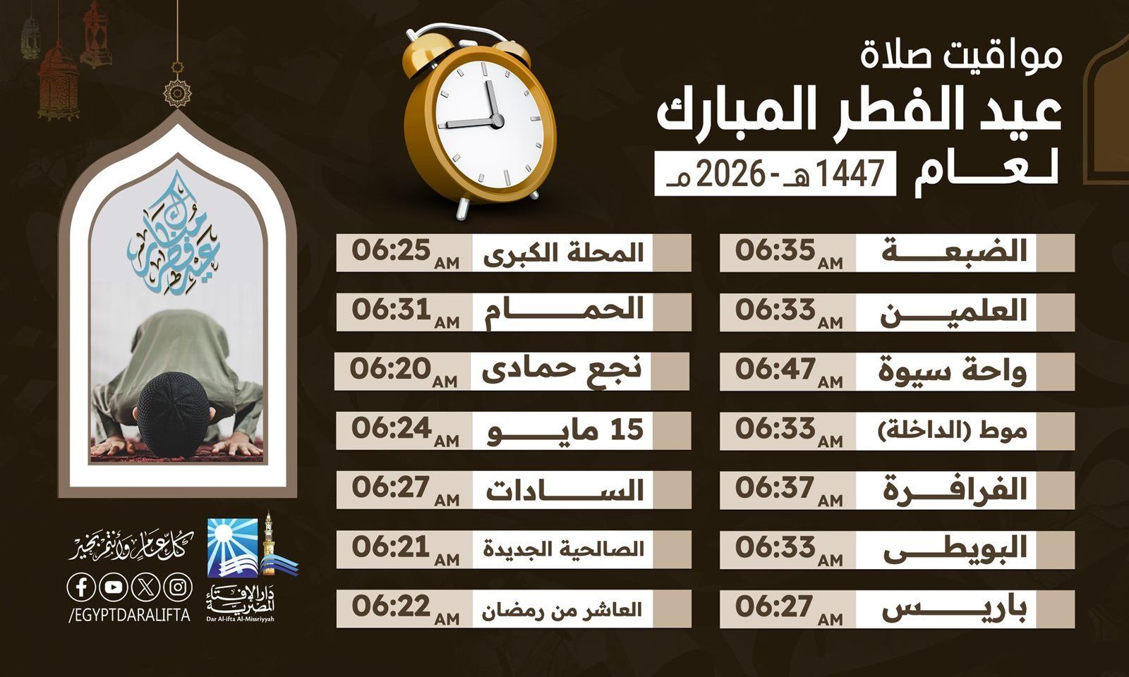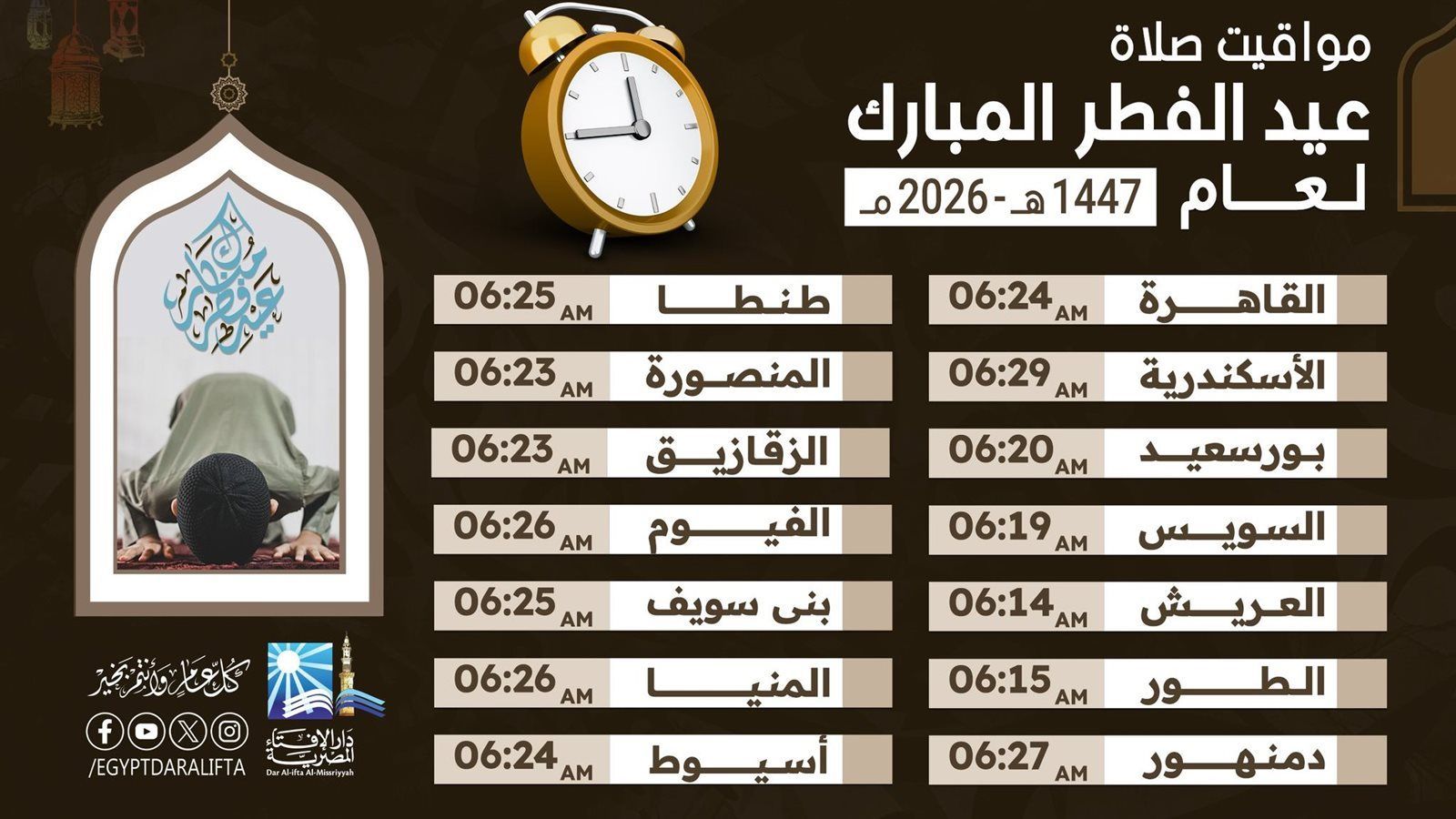 وتبدأ موعد صلاة عيد الفطر 2026 في محافظة القاهرة عند الساعة 6:24 صباحًا، وهو نفس التوقيت في الجيزة، بينما يحين موعدها في الإسكندرية في تمام الساعة 6:29 صباحًا، وفي بورسعيد عند 6:20، والسويس عند 6:19 صباحًا.