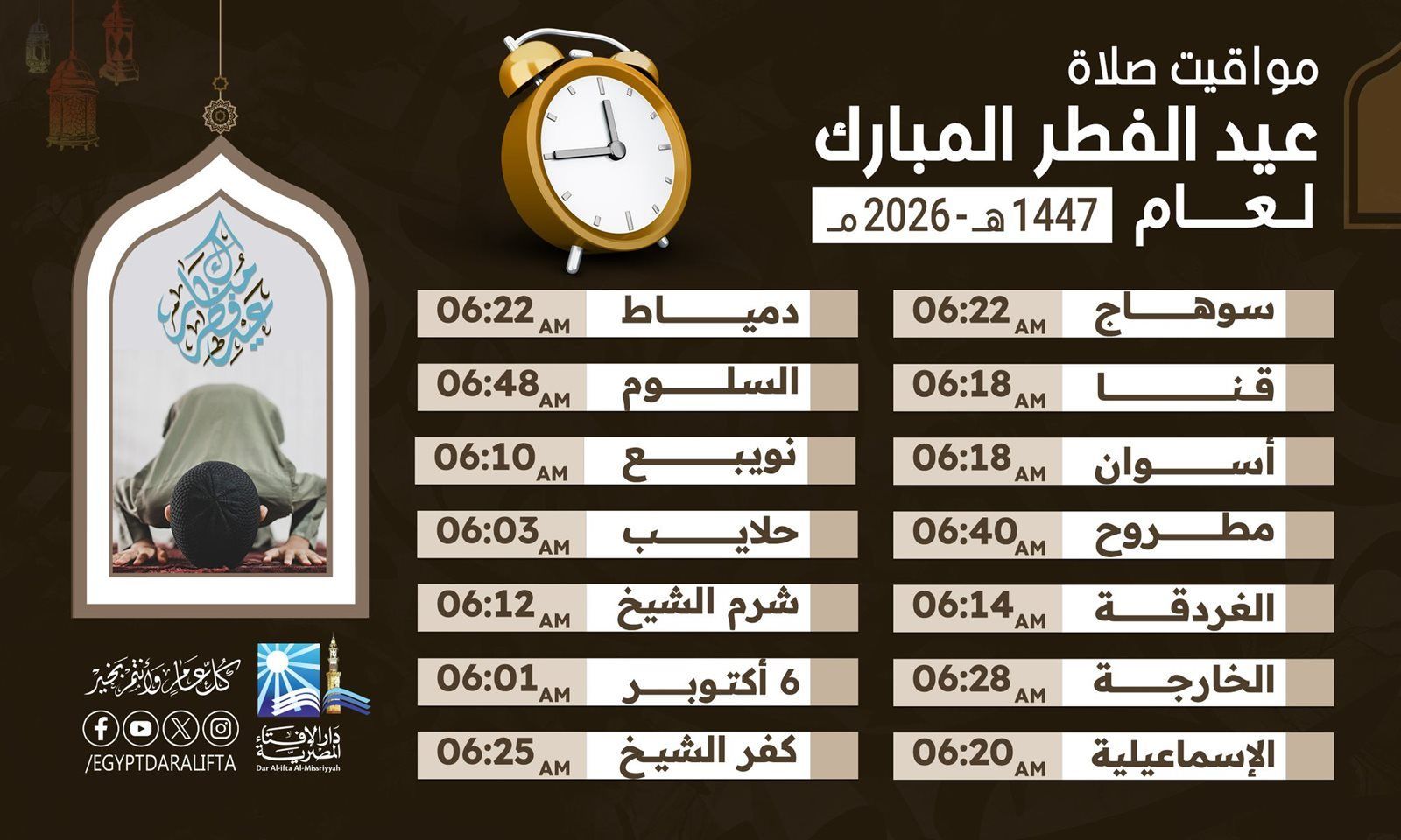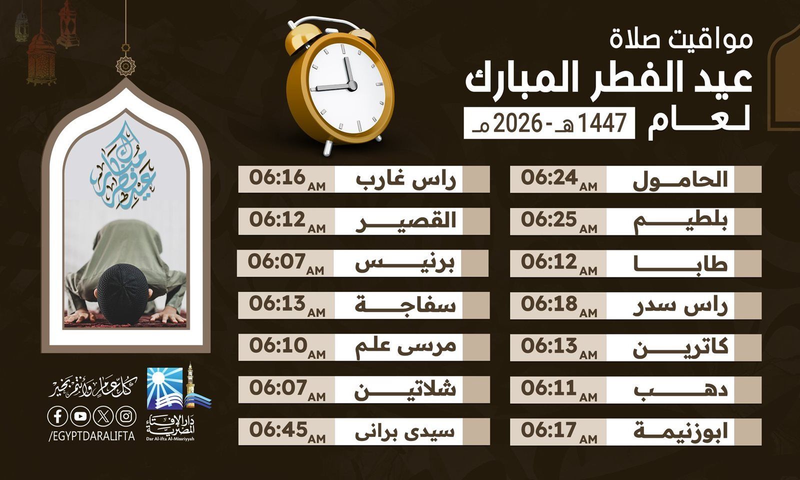 وفي باقي المحافظات والمدن الحدودية والساحلية، يختلف موعد صلاة عيد الفطر 2026 بشكل أوضح، حيث تقام الصلاة في مرسى مطروح عند 6:40 صباحًا، وهو من أحدث التوقيتات، بينما تأتي في الغردقة عند 6:14، وفي الخارجة عند 6:28، وفي الإسماعيلية عند 6:20، ودمياط عند 6:22، بينما تسجل السلوم 6:48 صباحًا كأحد آخر المواعيد، وفي نويبع 6:11، وحلايب 6:03، وشلاتين 6:07 صباحًا.