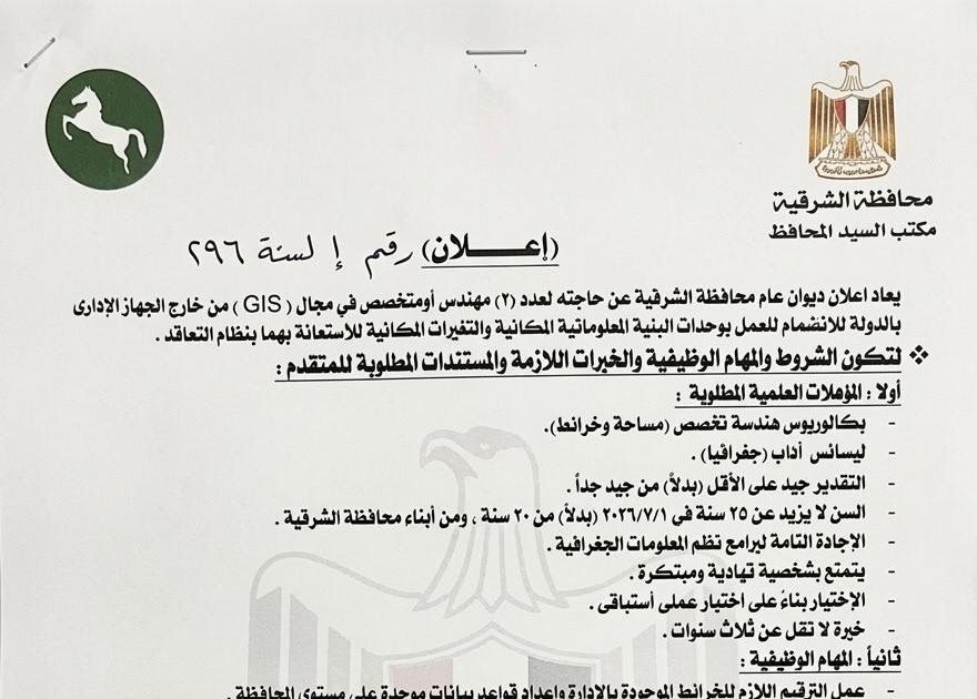 إعلان رقم 1 لسنة 2026 يعاد إعلان ديوان عام محافظة الشرقية عن حاجته لعدد (2) مهندس أو متخصص في مجال (GIS) من خارج الجهاز الإداري بالدولة للانضمام لوحدات البنية المعلوماتية المكانية والمتغيرات المكانية للاستعانة بهما بنظام التعاقد.