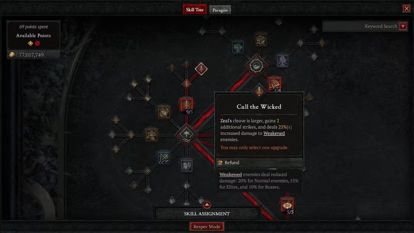 تشكل مهارة Zeal العمود الفقري لهذا البناء حيث يتم استثمار معظم نقاط المهارة فيها للحصول على أعلى ضرر ممكن خاصة بعد تفعيل ترقية Cull the Wicked التي تزيد من مقدار الضرر الموجه إلى الأعداء المتأثرين بحالة Weaken. لذلك يتم تصميم بقية المهارات بحيث تساهم في تطبيق هذا التأثير أو دعم قدرة Paladin على الاستمرار في استخدام Zeal دون انقطاع أثناء القتال.