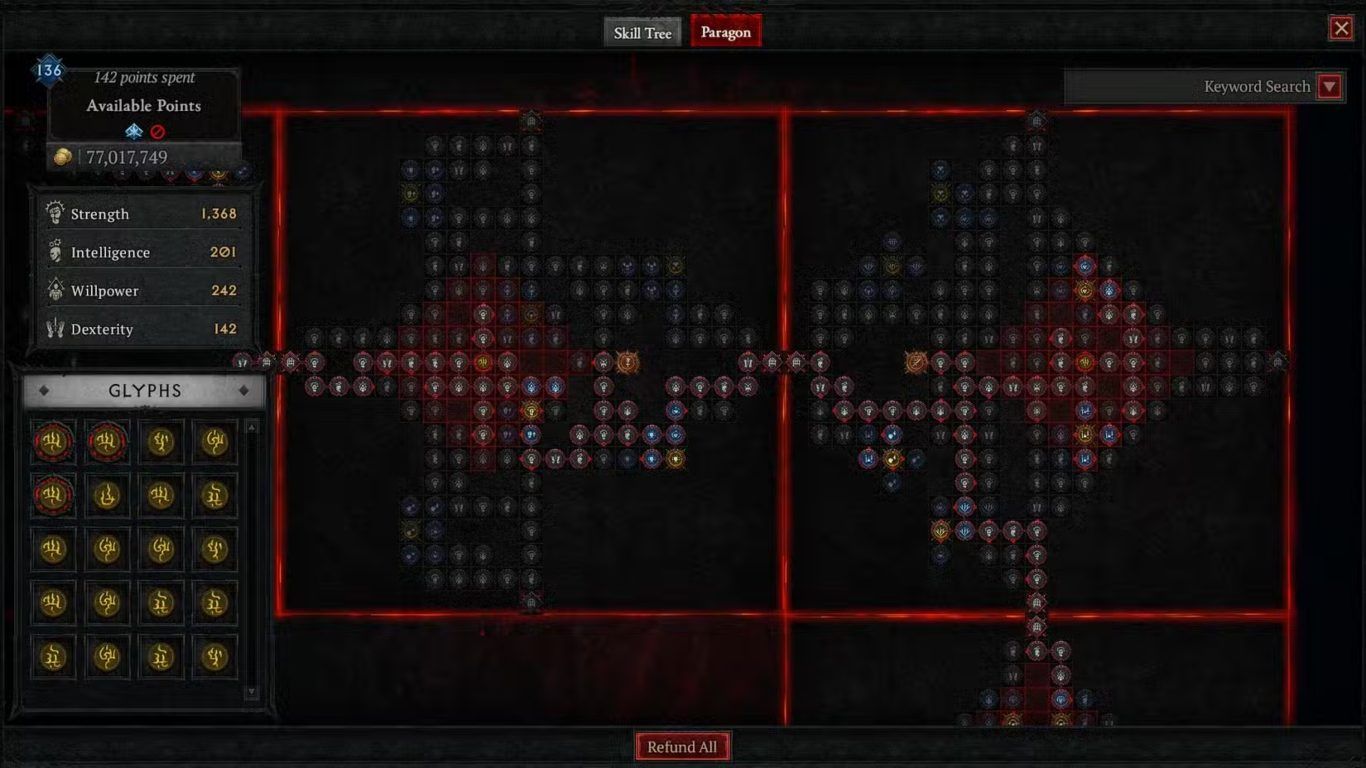 جدول لوحات Paragon في بناء Zeal Paladin في لعبة Diablo 4
