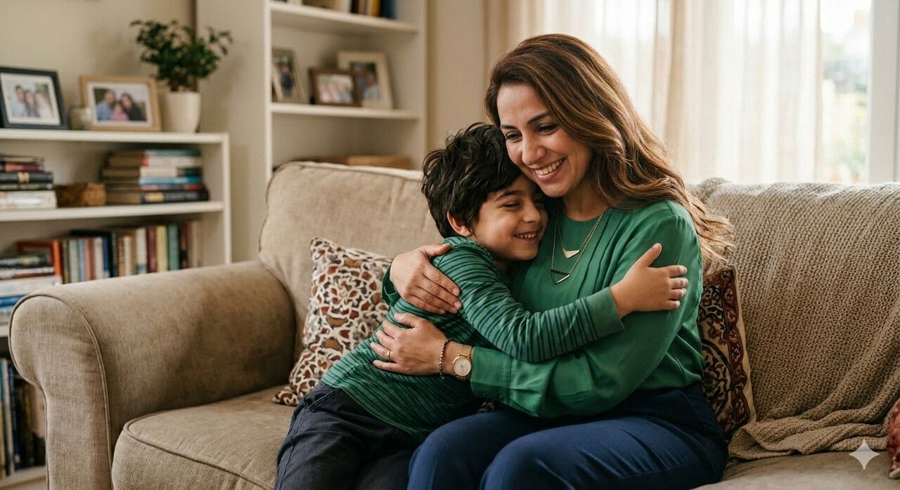 وأحب أيضاً اللحظات التي نجلس فيها مساءً عندما أكون متعباً قليلاً بعد اللعب أو بعد المدرسة. تقولين لي: "تعال، أخبرني ماذا حدث اليوم." ثم أبدأ أحكي لك كل شيء: من فاز في لعبة كرة القدم في المدرسة، ومن قال نكتة مضحكة في الصف، وحتى كيف سقط قلمي ثلاث مرات تحت الطاولة. ربما تبدو هذه الأشياء صغيرة، لكنك تستمعين لي وكأنها قصص مهمة جداً. وهذا يجعلني أشعر بأن يومي كله مهم لأنك تسمعينه.