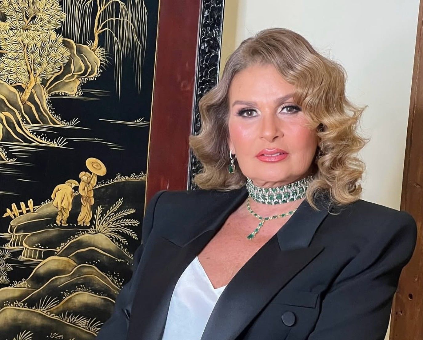 تعتمد إلهام شاهين في هذه الإطلالة مكياجاً ناعماً يعزز جمال ملامحها بأسلوب أنثوي أنيق يناسب المناسبات الخاصة. ارتكز المكياج على بشرة موحدة ومضيئة بلمسة طبيعية، مع استخدام بلاشر وردي خفيف أضفى على الوجه إشراقة صحية ومنح الملامح حيوية واضحة. أما مكياج العيون فجاء بأسلوب بسيط وراق، حيث تم اعتماد ظلال عيون بدرجات النيود الفاتحة مع تحديد ناعم للعين بالأيلاينر، إلى جانب طبقات خفيفة من الماسكرا التي أبرزت الرموش ومنحت النظرة عمقاً جذاباً دون مبالغة. واكتمل المكياج بأحمر شفاه وردي لامع متناغم مع لون البلاشر، ما منح الإطلالة لمسة أنثوية ناعمة ومشرقة تناسب الأجواء الاحتفالية.