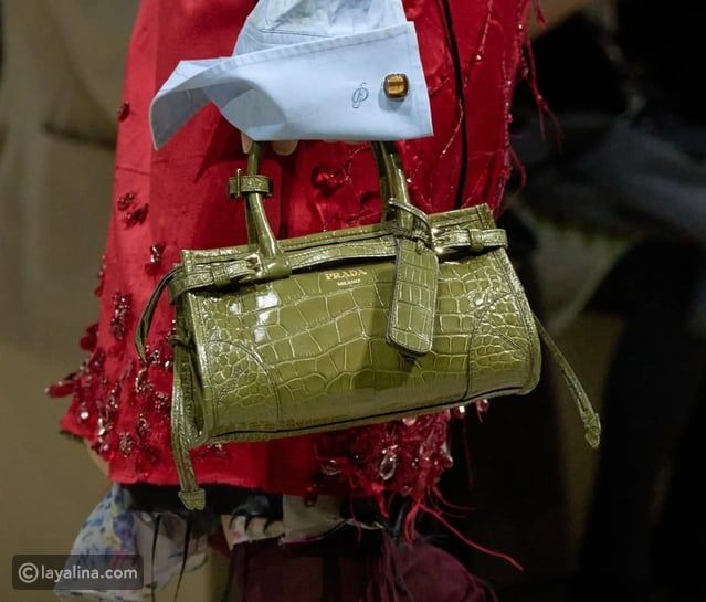 - فقد قدمت برادا نسخًا بنقشة جلد الثعبان مع درجات لونية مثل الأصفر الزيتوني والبني الشوكولاتة، مما يمنح الحقيبة حضورًا بصريًا قويًا دون الحاجة إلى تفاصيل معدنية إضافية.