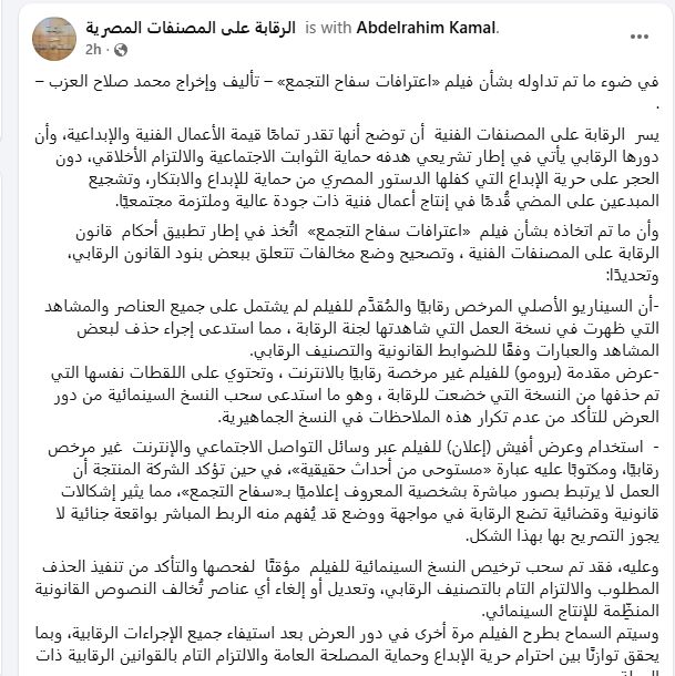 -أن السيناريو الأصلي المرخص رقابيًا والمُقدَّم للفيلم لم يشتمل على جميع العناصر والمشاهد التي ظهرت في نسخة العمل التي شاهدتها لجنة الرقابة ، مما استدعى إجراء حذف لبعض المشاهد والعبارات وفقًا للضوابط القانونية والتصنيف الرقابي.