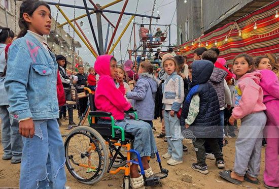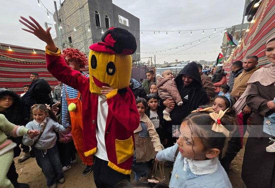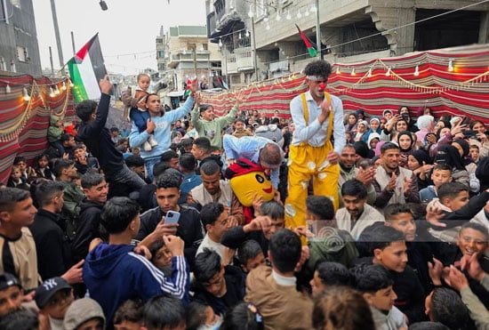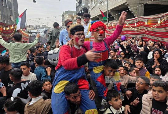ونقلت وكالة الأنباء الفلسطينية "وفا" تقريرًا رصدت فية انتشارًا لافتًا للمهرجين وسط أطفال غزة خلال احتفالات عيد الفطر 2026 داخل المخيمات المختلفة، في محاولة لنشر البهجة بين أطفال حُرموا طويلًا من أجواء العيد وطقوسه الطبيعية.