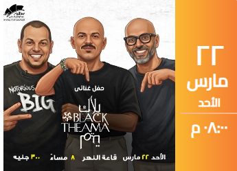 يحيي فريق بلاك تيما حفلا غنائيا، بقاعة النهر بساقية عبد المنعم الصاوى، وذلك اليوم الأحد 22 مارس، ومن المقرر أن يقدم بلاك تيما خلال الحفل باقة متنوعة من أغانيهم الشهيرة مثل "بحار" و"كل مرة" و"إيه يعنى" و"أخبار أهرام جمهورية".