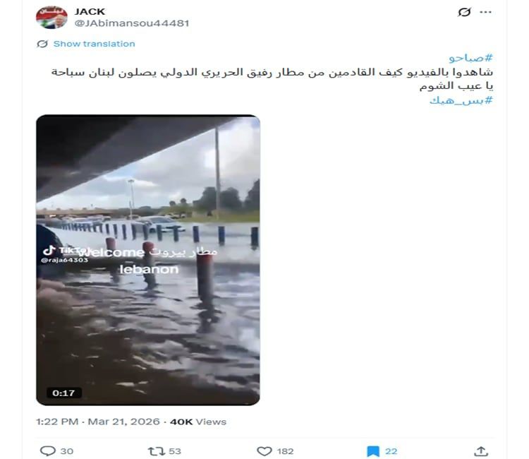 وحينها كتب الحساب الناشر للفيديو (tonighost5@): "مطار بيروت اليوم". ويتسق تاريخ نشر المقطع مع تقارير إخبارية في ذلك الوقت تحدثت عن تعرض مناطق في المطار للغرق نتيجة لمياه الأمطار.