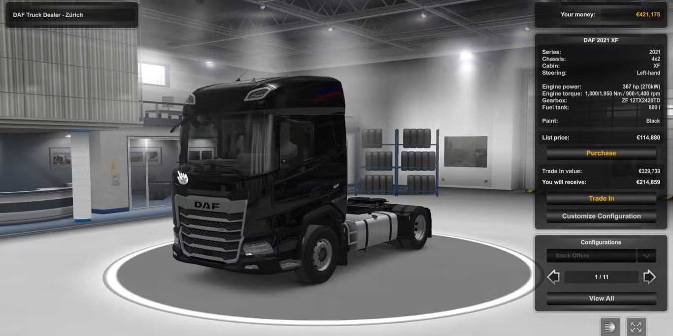 كخيار آخر مناسب للمبتدئين في Euro Truck Simulator 2، لدينا شاحنة DAF 2021. هذه الشاحنة تقع في الجانب الميسور التكلفة، حيث يأتي أرخص نموذج منها بسعر 114,360 يورو، وهو ما يجعلها واحدة من أكثر الشاحنات مناسبة لمن يبدأ رحلته في قيادة الشاحنات داخل اللعبة. تبدأ الشاحنة بقوة 299 حصانًا ويمكن أن تصل قوتها إلى 530 حصانًا عند اختيار أقوى خيار للمحرك المتاح. إلى جانب ذلك، يمكن للاعبين توقع وجود خزان وقود بحجم مناسب يلبي احتياجات الرحلات القصيرة والطويلة، حيث يتراوح حجم الخزان من 600 لتر إلى 1465 لتر اعتمادًا على الترقية المختارة.