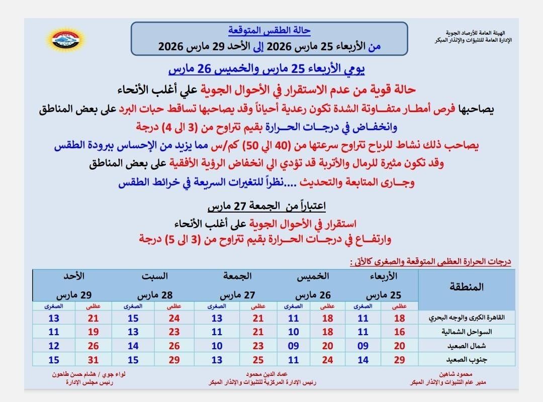 الإثنين، 23 مارس 2026 07:48 متشهد حالة الطقس في مصر موجة من التقلبات الجوية الحادة بداية من الأربعاء المقبل، وفق ما أعلنته الهيئة العامة للأرصاد الجوية، والتي حذرت من عدم استقرار الأحوال الجوية على أغلب أنحاء الجمهورية خلال الفترة من 25 وحتى 29 مارس 2026.
