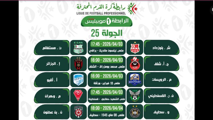 كشفت الرابطة الجزائرية المحترفة لكرة القدم عن برنامج مباريات الجولة الـ25 من البطولة، والتي ستُجرى يومي 3 و4 أفريل المقبل، في جولة تعد بالإثارة على مستوى جميع الملاعب.