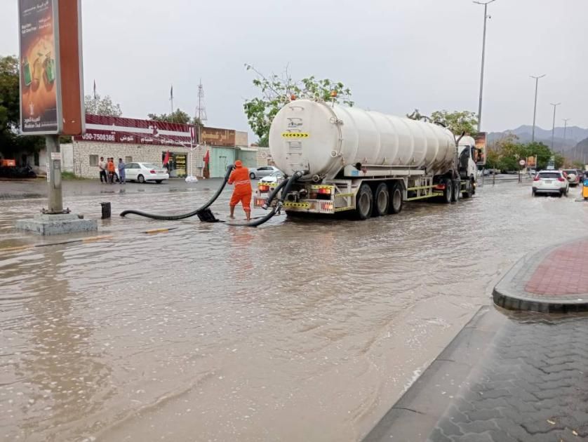 في إمارة الفجيرة، شهدت مدنها ومناطقها المتعددة أمطاراً متفاوتة الشدة بلغت ذروتها في بعض الفترات، ما أدى إلى تشكل برك مائية في الشوارع الرئيسية والفرعية، خاصة في المناطق المنخفضة، كما أدت إلى جريان الشعاب الجبلية والأودية نتيجة كثافة الهطول، الأمر الذي استدعى الفرق الشرطية لتكثيف دورياتها المرورية والأمنية في الشوارع والأودية تحسباً للتعاطي مع أي مستجدات بشكل عاجل. وامتدت الحالة المطرية إلى مدن المنطقة الشرقية التابعة لإمارة الشارقة، بما في ذلك كلباء وخورفكان ودبا الحصن، حيث شهدت هذه المدن هطول أمطار غزيرة مصحوبة برياح نشطة أحياناً، وانخفاض ملحوظ في درجات الحرارة، وتبشر السماء الملبدة بالغيوم بهطول المزيد من الأمطار خلال الفترة المقبلة.