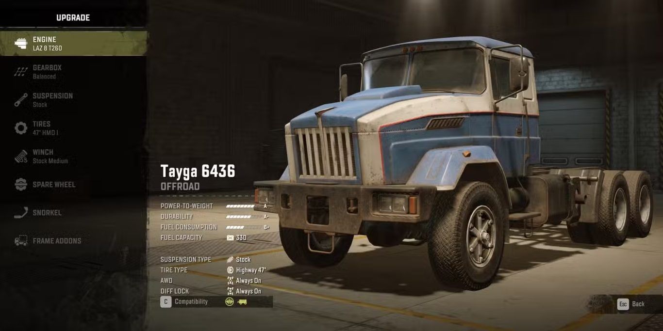 مناسبة تمامًا للاعبين الجدد، حيث تتسم Tayga 6436 بالتسامح عند القيادة على التضاريس الصخرية مع الحفاظ على الجر. ينبغي للاعبين استكشاف خيارات الإطارات الموحلة المخصصة، التي تعزز أداء الشاحنة بشكل كبير. بينما تكون 6436 محدودة أكثر فيما يخص إضافات الرافعات والصيانة، فإن سرعتها ومدى تحركها يجعلها واحدة من أفضل الشاحنات في SnowRunner.