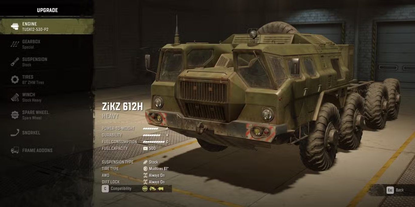 تُعد ZiKZ 612H مركبة ذات مستوى عسكري يمكنها إتمام أي مهمة يكلفها بها اللاعبون. توفر مستويات عزم دوران قصوى، مما يسمح للشاحنة بالمرور عبر أعمق الوحل. وما يثير الإعجاب أكثر هو تنوع استخداماتها، إذ يمكن للاعبين تركيب مجموعة متنوعة من الرافعات ووحدات الخدمة. إذا كان السائقون يخشون الانقلاب باستمرار بعيدًا عن المرائب، فإن تصميم 612H المستقر للغاية يمنحهم راحة إضافية. لقد جعلت التحديثات الأخيرة الشاحنة أكثر قوة، إلا أنها لا تزال عرضة لكمية مفاجئة من الأضرار مقارنة بالشاحنات الثقيلة الأخرى.