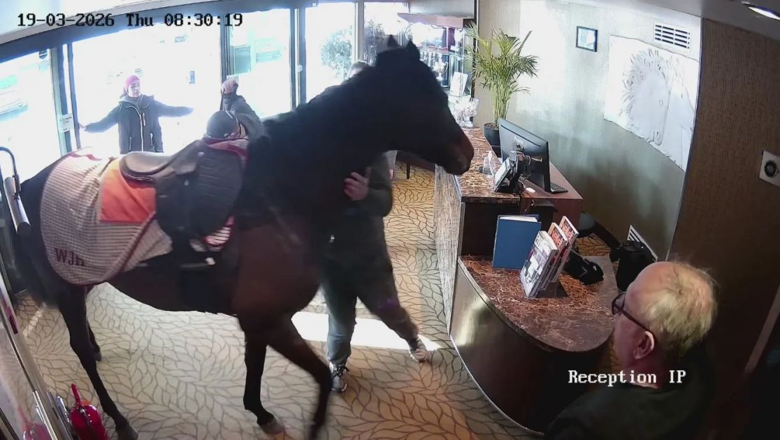 وخرج الحصان من إسطبل ويليام هاجاس، وفق اللجام الذي عليه، بدون إصابة من الحادثة الغريبة وسط تفاعل كبير من رواد مواقع التواصل وغرد أحدهم: «معظم الفنادق لا يأتيها ضيوف مثل هذا في البهو».