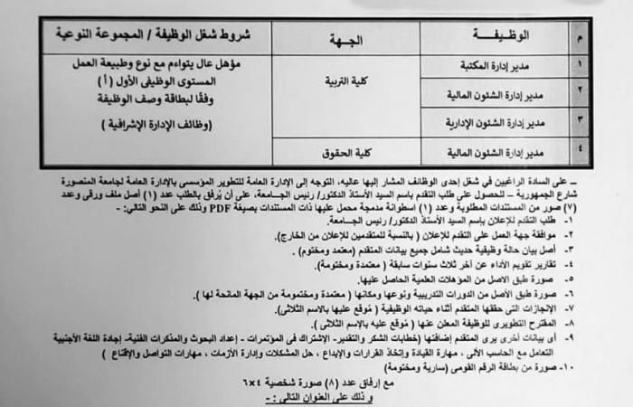 ما هي الشروط المطلوبة في وظائف جامعة المنصورة؟