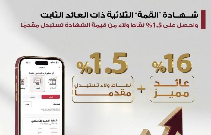 الآن ولفترة محدودة أتاح بنك مصرعند شراء أو تجديد شهادة “القمة” الثلاثية حصول العملاء على 1.5% من قيمة الشهادة في صورة نقاط ولاء مقدمًا تستخدم أو تستبدل بكاش باك وفقًا للشروط المنظمة لذلك من خلال برنامج المكافآت بما يتيح لهم الاستفادة من قيمتها من خلال العديد من التجار وذلك اعتباراً من 24 مارس 2026، هذا وتعد شهادة ادخار “القمة” الثلاثية ذات العائد السنوي الثابت 16% بدورية صرف شهرية، من بنك مصر من الأوعية الادخارية المتميزة التي يقدمها البنك.