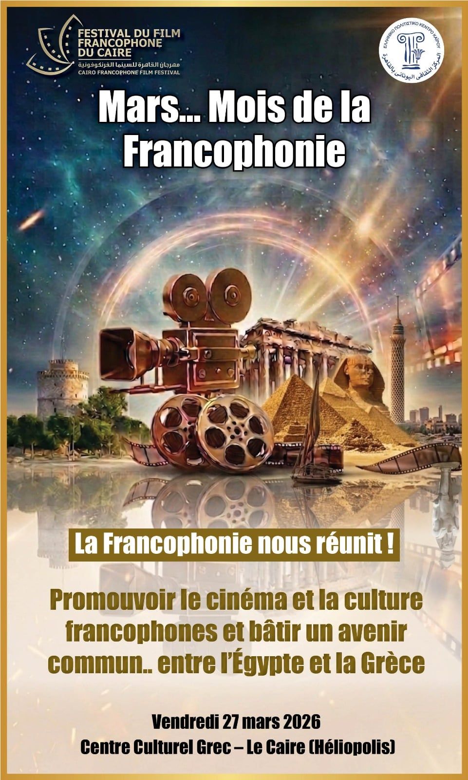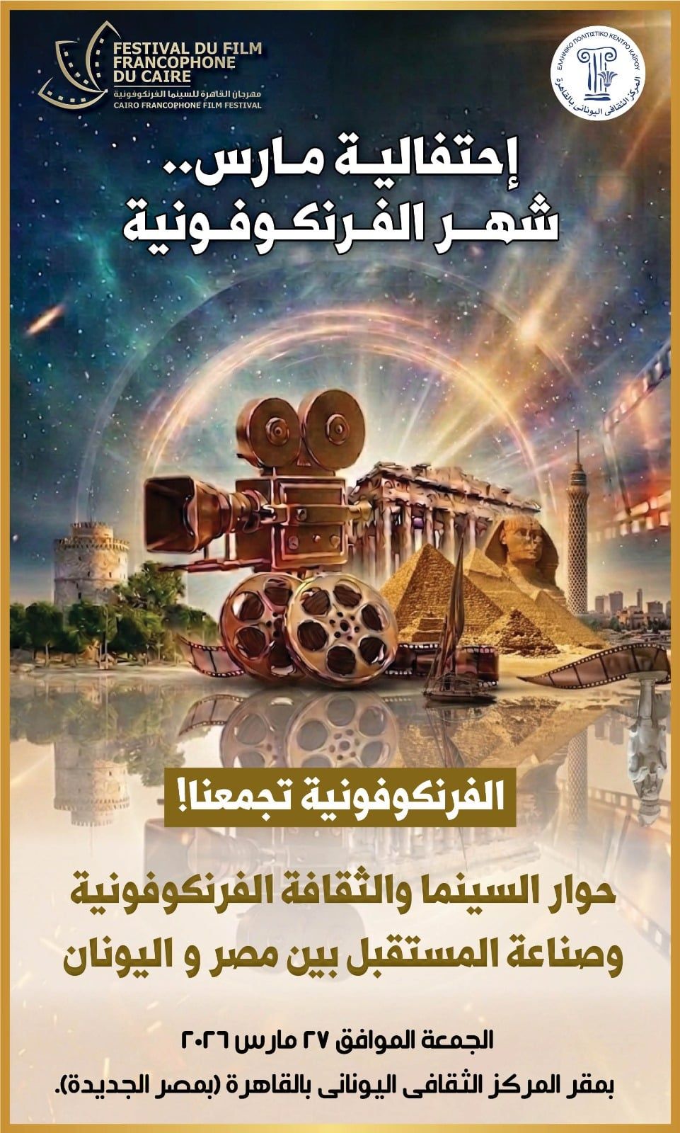 فى إطار الاحتفالات باليوم العالمى للفرنكوفونية وشهر مارس الذى يعد شهراً عالمياً للإحتفاء بالثقافة الفرنكوفونية، أعلن مهرجان القاهرة للسينما الفرنكوفونية، برئاسة الكاتب الصحفى والناقد السينمائى الدكتور ياسر محب، عن تنظيم احتفالية سينمائية وثقافية خاصة، احتفاء باليوم العالمى للفرنكوفونية 2026، تقام بعد غد الجمعة الموافق 27 مارس الجارى بمقر المركز الثقافى اليونانى بالقاهرة، بمصر الجديدة.