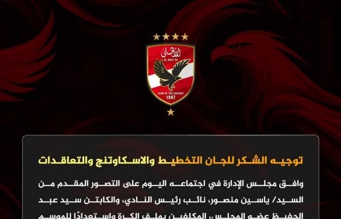 كما وافق مجلس الإدارة في اجتماعه اليوم على التصور المقدم من ياسين منصور، وسيد عبدالحفيظ، المكلفين بملف الكرة واستعدادًا للموسم الجديد، والذي يقضي بـ: توجيه الشكر للجنة التخطيط، وإدارة الاسكاوتنج، وإدارة التعاقدات، مع التأكيد على التقدير الكامل لما قدمته اللجان الثلاث.