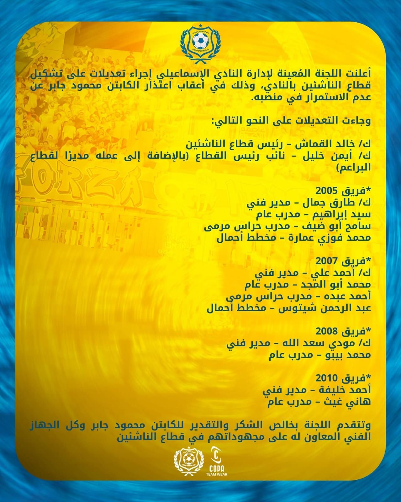 الأربعاء، 25 مارس 2026 11:26 مأعلنت اللجنة المعينة لإدارة النادي الإسماعيلي إجراء تعديلات على تشكيل قطاع الناشئين بالنادي، وذلك في أعقاب اعتذار محمود جابر عن عدم الاستمرار في منصبه.