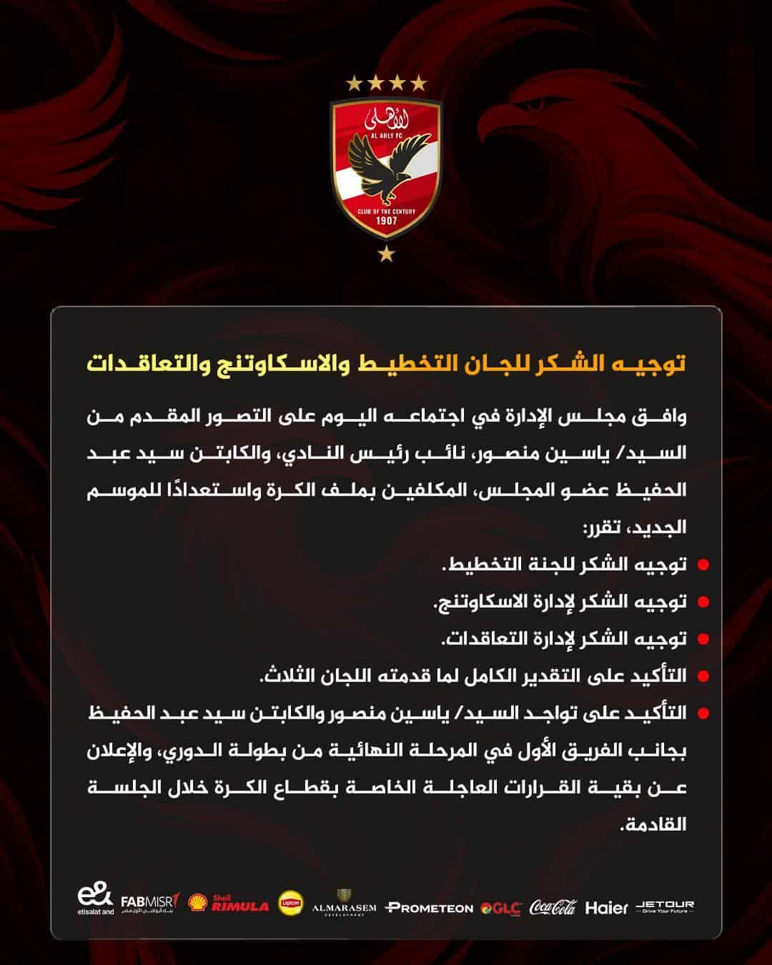 وبحسب الموقع الرسمي للأهلي، فإنه بناء على طلب محمود الخطيب، رئيس النادي، وافق مجلس الإدارة في اجتماعه اليوم على تكليف ياسين منصور نائب الرئيس، وسيد عبد الحفيظ، عضو المجلس، بمهمة الإشراف العام على شئون كرة القدم، مع منحهما كافة الصلاحيات والدعم الكامل من مجلس الإدارة.