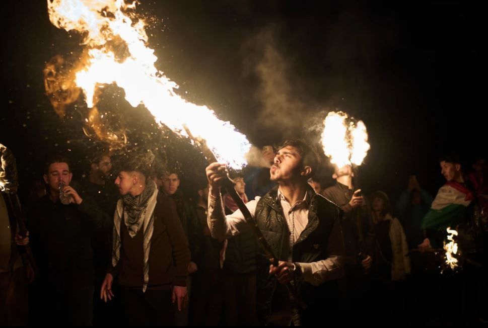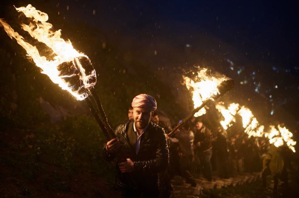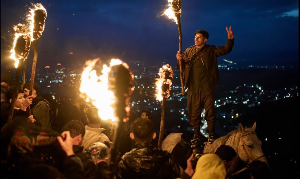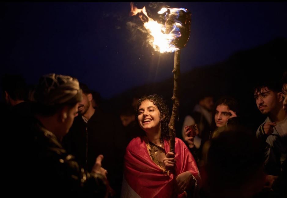 يحتفل آلاف الأكراد بعيد النيروز في مدينة عقرة، مركز إقليم كردستان العراق، حيث يرتدون الملابس الكردية التقليدية، ويتسلقون الجبال حاملين المشاعل، ويطلقون الألعاب النارية، ويعزفون الموسيقى، فيما يأتي احتفال هذا العام في ظل الحرب الإقليمية التي شنتها الولايات المتحدة وإسرائيل ضد إيران