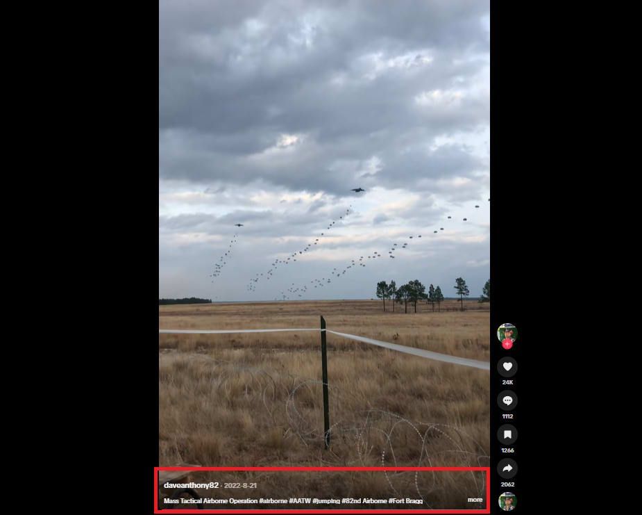 وفي حين لا يتوافر سياق واضح للفيديو، كتب ناشره في تعليقه عليه: "اكتشف عملية القفز الجماعي المذهلة للفرقة 82 المحمولة جوًا في فورت براغ"، وهي قاعدة رئيسية للقوات الخاصة الأمريكية والفرقة 82 في كارولاينا الشمالية.