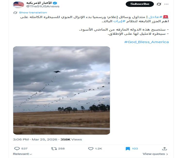 تزامن تداول الفيديو مع تقارير حول عمليات إنزال جوي أمريكية محتملة فوق أراضٍ إيرانية، لا سيما في نطاق جزيرة خرج ومضيق هرمز، الذي أغلقته إيران أمام مرور ما يقدر بنحو 20% من صادرات النفط العالمية.