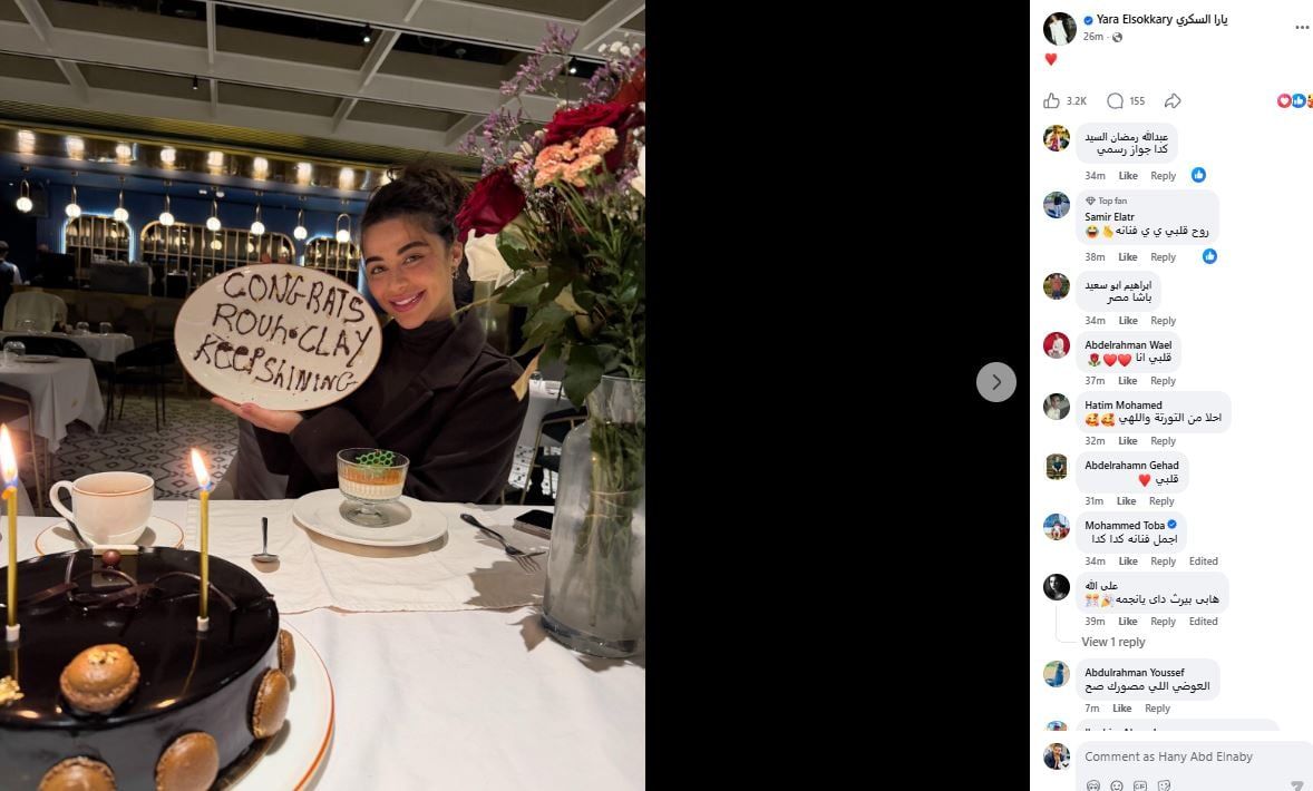ونشرت يارا السكري صورة لها مع تورتة وقطع من الشيكولاتة مكتوب عليها: مبروك روح وكلاي.. استمروا في التألق، فى إشارة للنجاح الكبير الذى حققه مسلسل على كلاي الذي عرض خلال شهر رمضان الماضي.