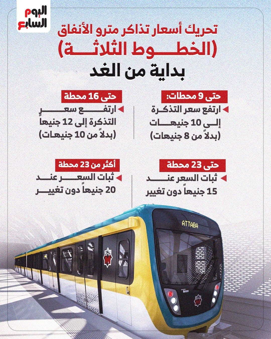 وفقاً للبيان الرسمي، شهدت الشريحة الأولى لمترو الأنفاق، والتي تشمل التنقل حتى 9 محطات، تحريكاً في السعر لتصبح بـ 10 جنيهات بدلاً من 8 جنيهات. كما شمل القرار الشريحة الثانية التى تغطي التنقل حتى 16 محطة، حيث ارتفع سعر التذكرة ليصل إلى 12 جنيهاً بدلاً من 10 جنيهات، بزيادة قدرها جنيهان لكل من الشريحتين.