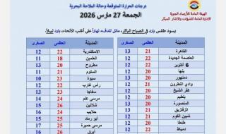 الجمعة، 27 مارس 2026 08:00 صتتوقع هيئة الأرصاد الجوية، أن يشهد الطقس اليوم الجمعة، تحسنا فى الأحوال الجوية ليسود طقس بارد في الصباح الباكر، مائل للدفء نهاراً على أغلب الأنحاء بارد ليلاً.