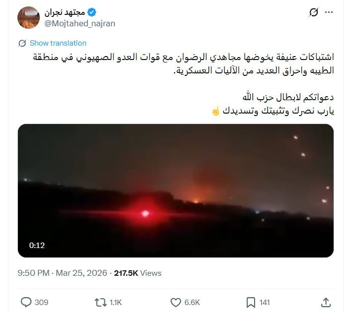 ورافق المقطع تعليق يقول: "اشتباكات عنيفة يخوضها مجاهدي الرضوان مع قوات العدو الصهيوني في منطقة الطيبة وإحراق العديد من الآليات العسكرية. دعواتكم لأبطال حزب الله، يارب نصرك وتثبيتك وتسديدك".