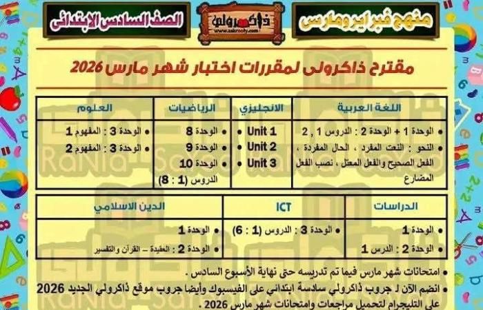 مقرر امتحانات شهر مارس للصف السادس الابتدائي الترم الثاني 2026