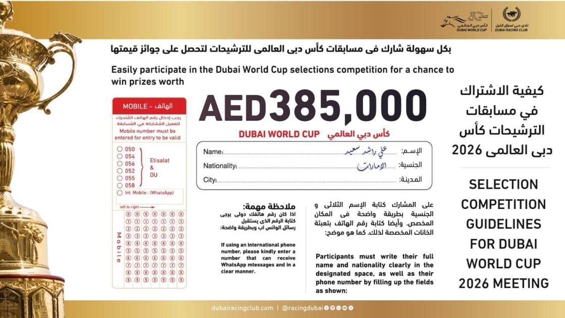 أعلنت اللجنة المنظمة لكأس دبي العالمي عن تفاصيل مسابقات الترشيحات للجماهير، والتي يبلغ إجمالي جوائزها المالية 385 ألف درهم.