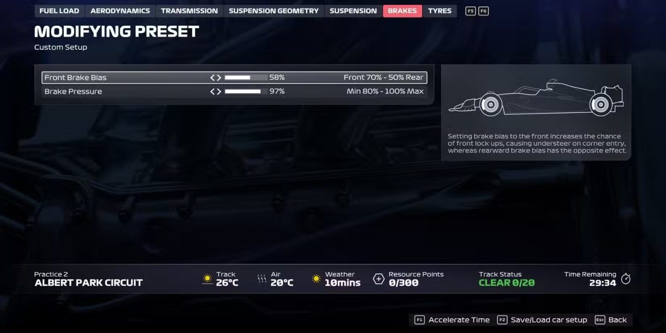 إذا كنت ترغب في التوجيه أثناء الكبح، فمن الأفضل أن تكون قيمة انحياز المكابح قريبة من 50%. ويُعد هذا الإعداد مفيدًا بصورة خاصة في المنعطفات الحادة جدًا أو المنعطفات على شكل حرف U. أما إذا كانت المنعطفات أقل حدة ولا يتطلب الأمر الكبح والتوجيه في الوقت نفسه، فإن زيادة انحياز المكابح نحو المحور الأمامي تكون خيارًا مناسبًا، وتُعد قيمة تقارب 60% مناسبة في هذه الحالة.