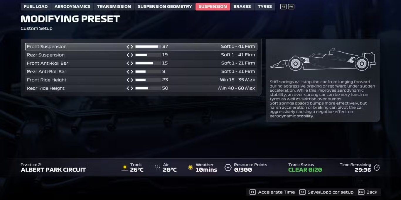 أما عند ضبط نظام التعليق ليكون بأقصى درجة من الصلابة، فإن السيارة تصبح أكثر عرضة لفقدان السيطرة عند المرور فوق المطبات بسرعات عالية. وإضافة إلى ذلك، تؤدي زيادة صلابة نظام التعليق إلى ارتفاع معدل تآكل الإطارات، مما قد يؤثر في أداء السيارة خلال السباق.