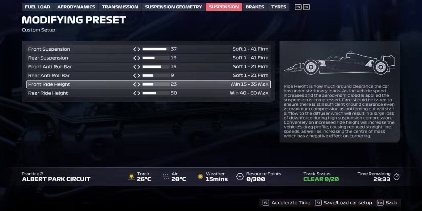 يؤدي خفض ارتفاع السيارة إلى زيادة احتمالية احتكاك الجزء السفلي من السيارة بمطبات الحلبة، مما يجعلها أكثر عرضة للاصطدام بقاعها وفقدان السيطرة. ولهذا السبب، لا يُعد تقليل ارتفاع السيارة إلى الحد الأدنى خيارًا مناسبًا، رغم أنه يُوصى بالإبقاء عليه أقل من منتصف النطاق لتحقيق توازن أفضل بين السرعة والاستقرار.