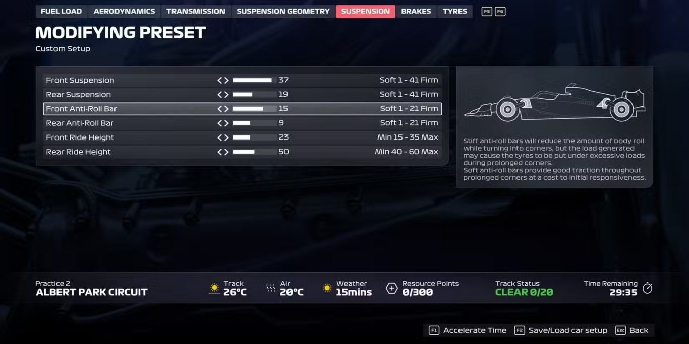 وبالحديث عن الفرق بين نظام التعليق الأمامي والخلفي، فإن زيادة صلابة نظام التعليق الخلفي تجعل السيارة أسرع، لكنها تقلل من قدرتها على اجتياز المنعطفات بفعالية عند السرعات المنخفضة. في المقابل، يحسّن نظام التعليق الخلفي الأكثر ليونة التماسك في المنعطفات، لكنه يزيد من احتمالية حدوث الانزلاق الزائد. أما نظام التعليق الأمامي، فلا يؤثر في السرعة بدرجة كبيرة، لكنه يؤثر تأثيرًا مباشرًا في التوجيه. وإذا شعرت بأن السيارة لا تنعطف بالقدر الكافي عند السرعات المنخفضة، فيمكنك ضبط نظام التعليق ليكون أكثر ليونة لتحسين استجابة التوجيه.