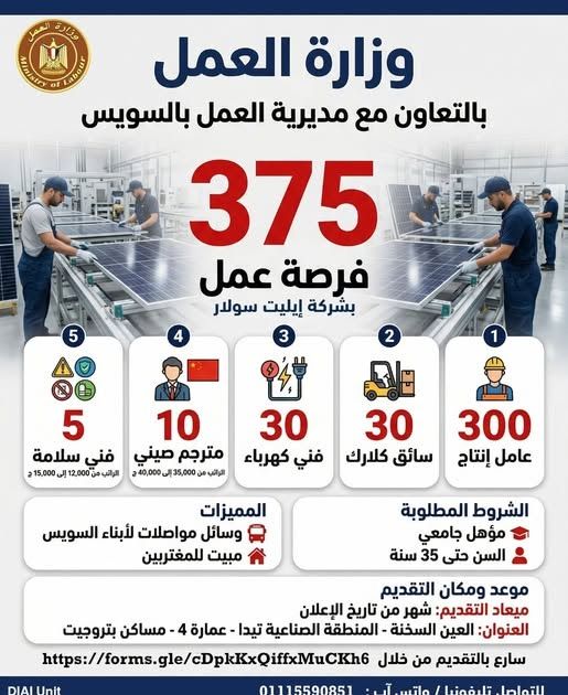 تعلن مديرية العمل بمحافظة السويس بالتنسيق مع الإدارة العامة للتشغيل بالوزارة ، وبالتعاون مع شركة "إيليت سولار" لتصنيع ألواح الطاقة الشمسية (المنطقة الصينية "تيدا" بالعين السخنة)، عن فتح باب التقديم لشغل 375 فرصة عمل في تخصصات متنوعة، وذلك تنفيذاً لتوجيهات معالي وزير العمل حسن رداد، وضمن مبادرة "التشغيل التكاملي" لربط الشباب بفرص العمل الحقيقية وتقليل معدلات البطالة.