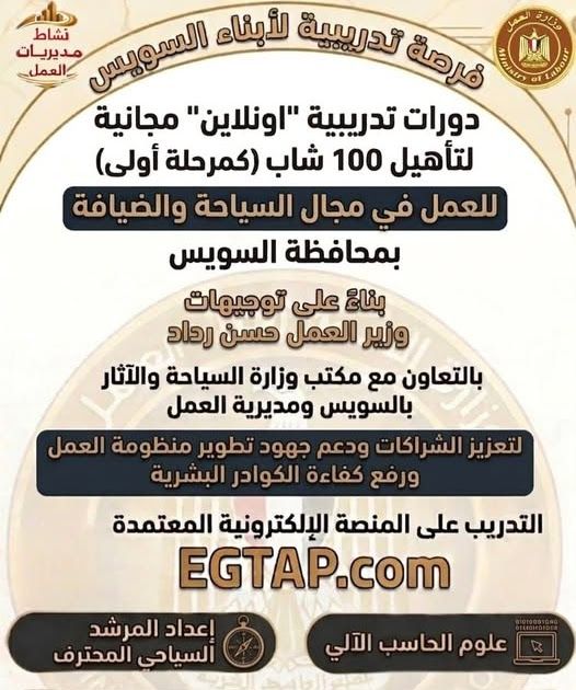 تعلن مديرية العمل بالسويس بالتعاون مع مكتب وزارة السياحة والآثار، عن إطلاق المرحلة الأولى لتأهيل الشباب للعمل بقطاع السياحة والضيافة، تنفيذًا لتوجيهات وزير العمل حسن رداد.