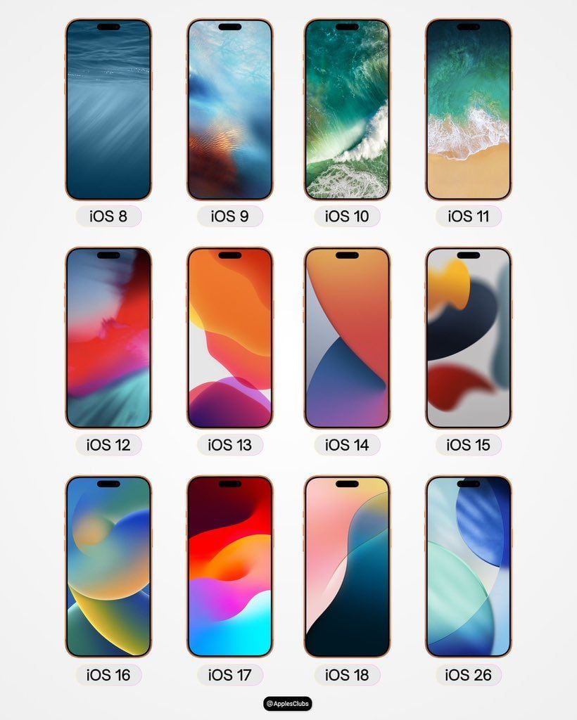 وتُظهر الصورة مجموعة من الخلفيات الرسمية بداية من iOS 8 وحتى الإصدارات الأحدث مثل iOS 18، حيث يتضح التحول التدريجي من الصور الواقعية مثل الأمواج والطبيعة في iOS 8 وiOS 9 وiOS 10، إلى التصاميم الأكثر تجريدًا ونعومة في الإصدارات اللاحقة.