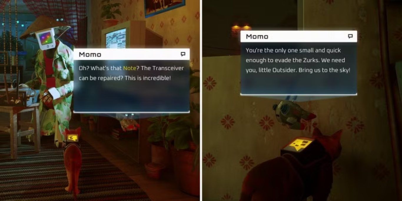 بعد جمع جميع دفاتر ملاحظات أعضاء Outsiders الأربعة، يمكن للاعبين العودة إلى Momo وعرض الثلاثة الآخرين عليه. أحد الدفاتر يحتوي على رسالة حول خلل في تصميم جهاز الإرسال الذي كان يعمل عليه، مما سيؤدي إلى قيام Momo بإصلاح الجهاز وطلبه من اللاعبين أخذه إلى أعلى مبنى قريب. ومع ذلك، سيقود ذلك اللاعبين إلى منطقة مليئة بـ Zurks ويدخلون بذلك الفصل الخامس من Stray، أسطح المباني.