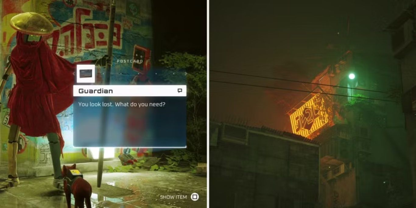 بعد أن تهدأ الأمور، يجب على اللاعبين إظهار البطاقة البريدية لـ Guardian أو أحد الروبوتات الأخرى التي تم الحصول عليها في نهاية الفصل الثالث من Stray. سيشير الروبوتون إلى وجود مجموعة من الروبوتات تُسمى Outsiders وهي خبيرة في الأمور الخارجية. ولحسن الحظ، يمكن العثور على العضو الأخير من هذه المجموعة داخل شقة قريبة بجانب لافتة نيون برتقالية.