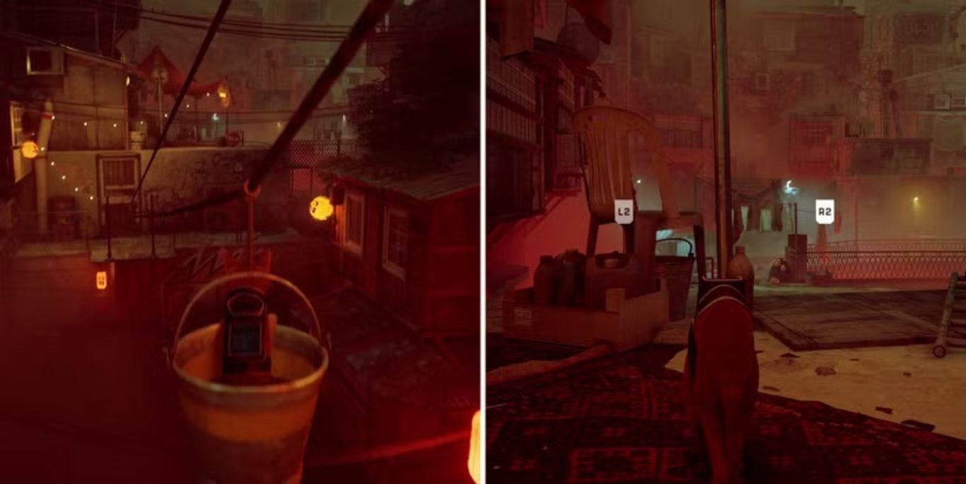 بعد تفعيل المصعد وركوبه إلى أعلى المبنى، يحتاج اللاعبون للصعود خارج المصعد عبر الكرسي الخشبي على اليمين، ثم توصيل جهاز الاستقبال بالهوائيات كما طلب Momo. النظر إلى السماء ليلاً سيؤدي تلقائيًا إلى تفعيل ثاني ذكرى رئيسية في قصة Stray، وبعد ذلك يمكن الركوب على الدلو القريب للنزول إلى شقة Momo وبدء الفصل السادس من اللعبة، The Slums – Part 2.