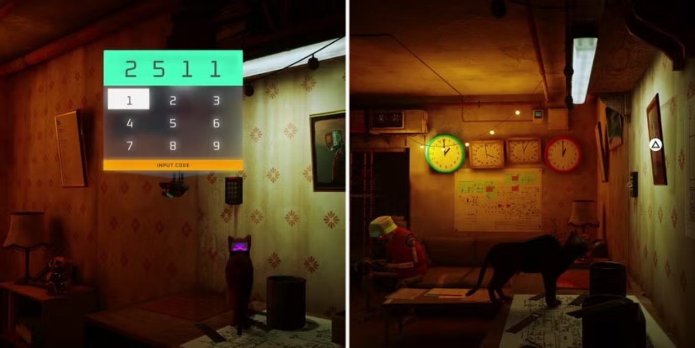 عند بدء الفصل السادس من Stray، سيجد اللاعبون أنفسهم داخل شقة Momo مرة أخرى. الغريب أن المالك غير موجود، لكن ملاحظة على التلفاز ستكشف بسرعة أنه ينتظر اللاعبين في Dufer Bar. لمغادرة الشقة، يجب على اللاعبين التفاعل مع لوحة المفاتيح بجانب النافذة المغلقة، الأمر الذي سيؤدي إلى قيام B-12 بإدخال رمز الأمان المعقد الخاص بـ Momo.