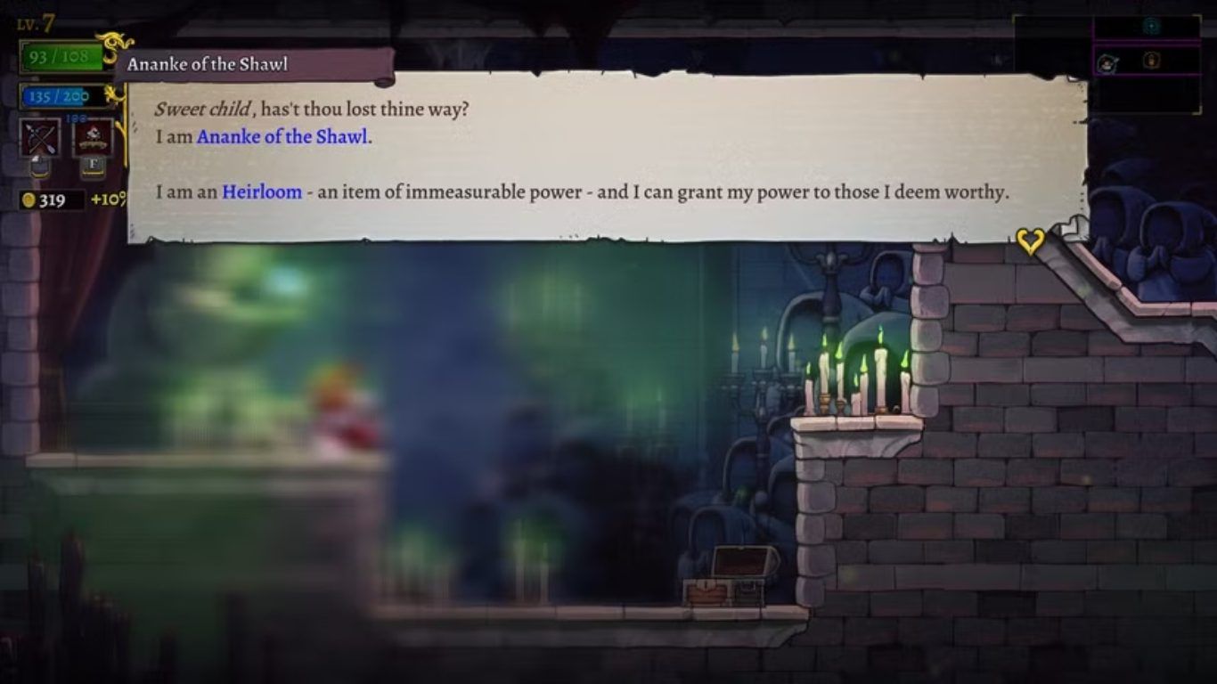 للحصول على Ananke’s Shawl Heirloom، يجب على اللاعبين أولًا العثور على الغرفة الخاصة بالتحف الوراثية. ابحث عن غرفة تحمل أيقونة شمعة برتقالية على الخريطة. الغرفة التي تحتوي على Ananke’s Shawl هي مساحة أفقية كبيرة تحتوي على تمثال في أقصى اليسار.