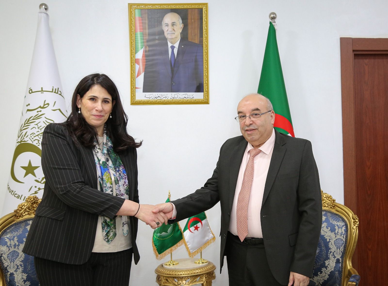 استقبل وزير الصناعة الصيدلانية، الدكتور وسيم قويدري، اليوم الثلاثاء بمقر الوزارة، نائبة رئيس مفوضية الاتحاد الإفريقي، سلمى مليكة حدادي، التي كانت مرفوقة برئيس قسم الصحة بالاتحاد الإفريقي، الدكتور أدامو إساه .